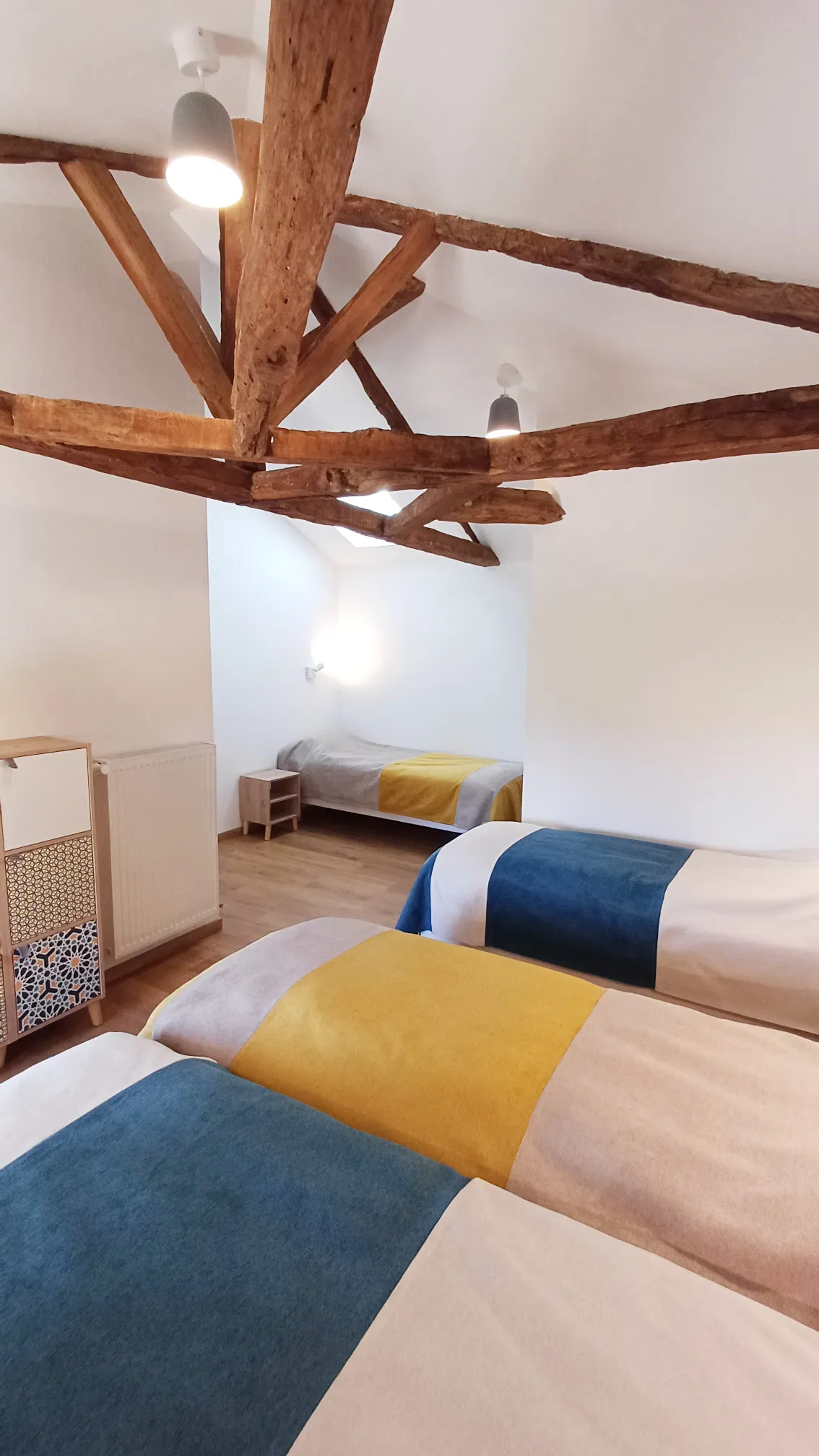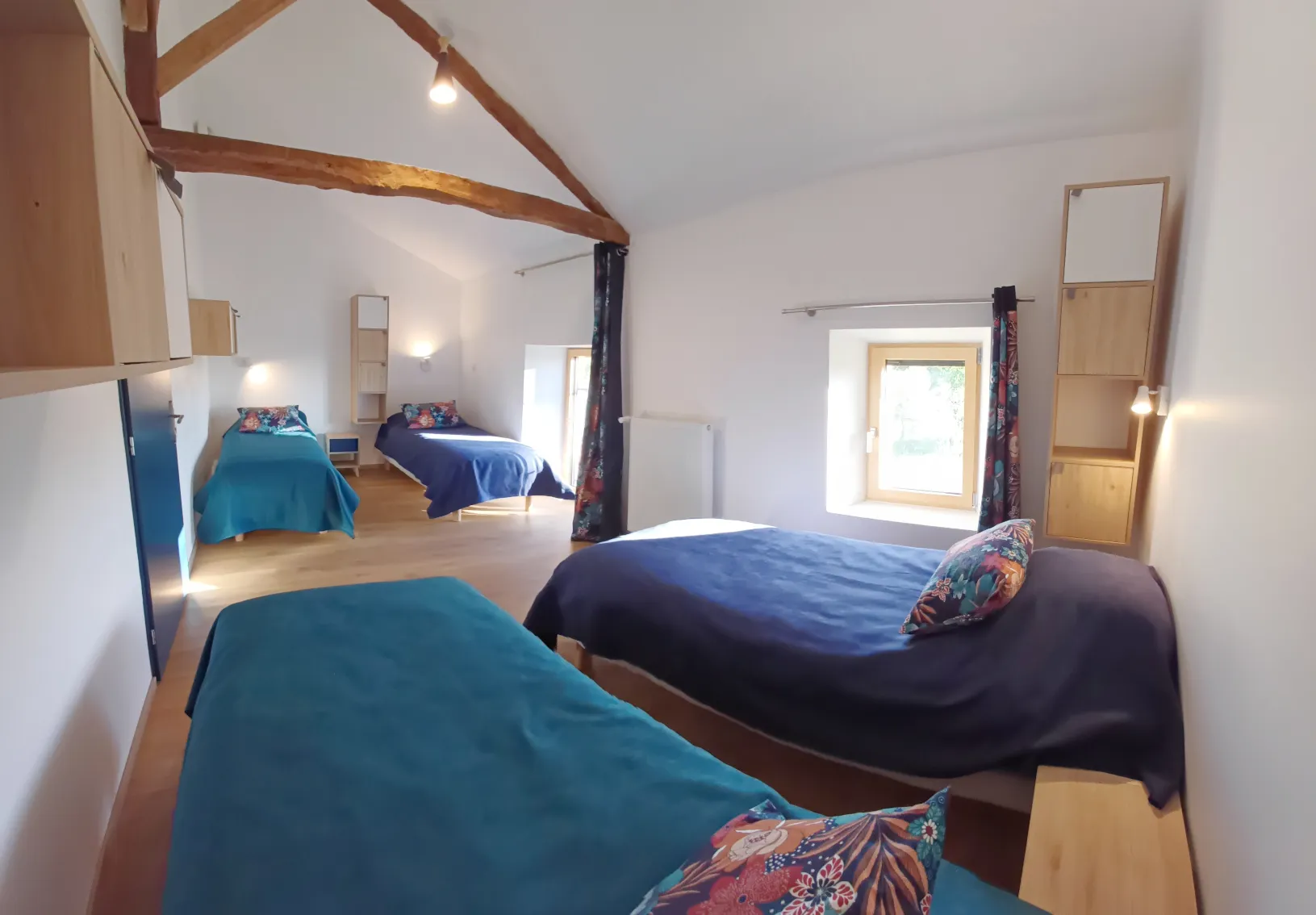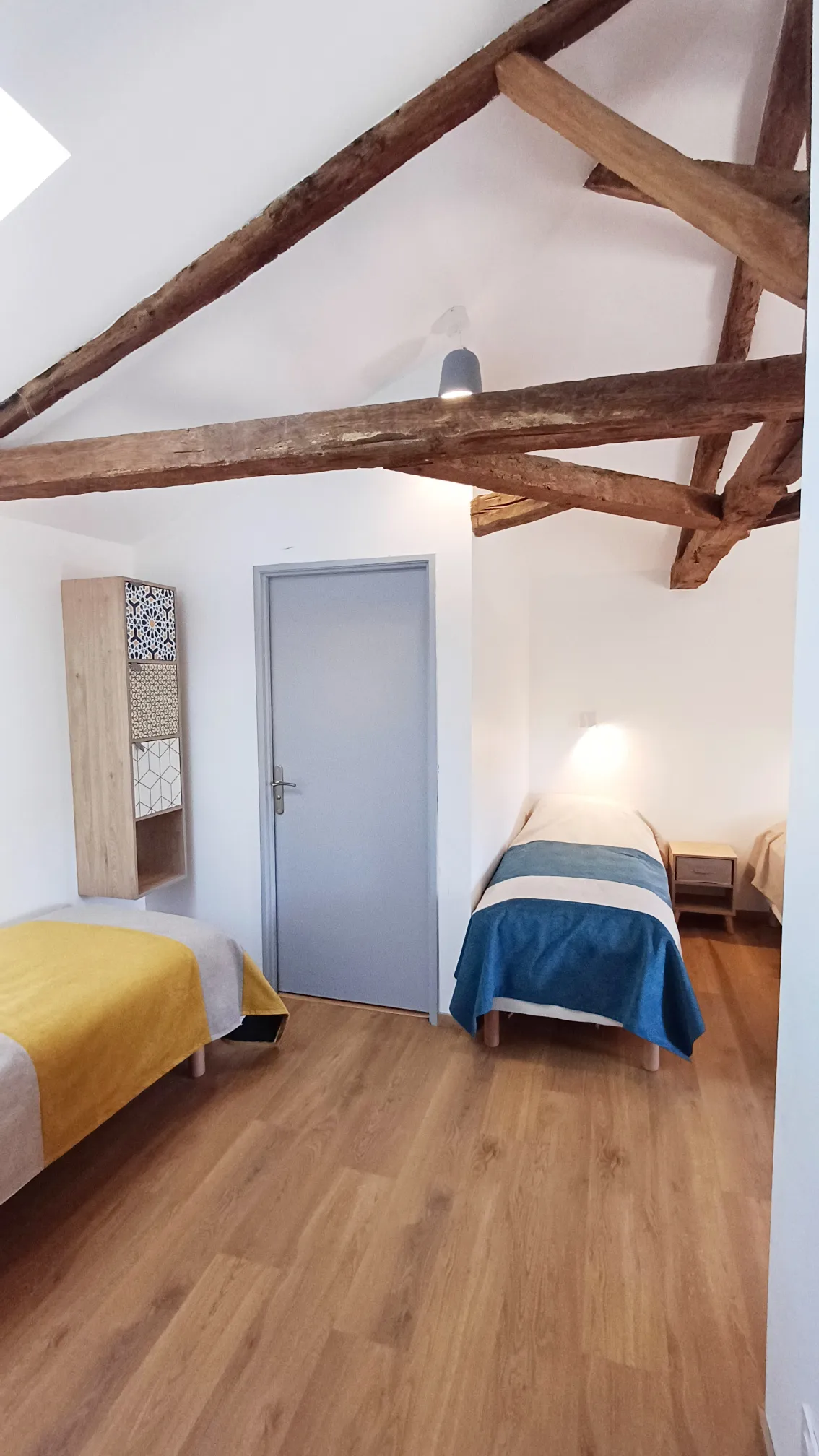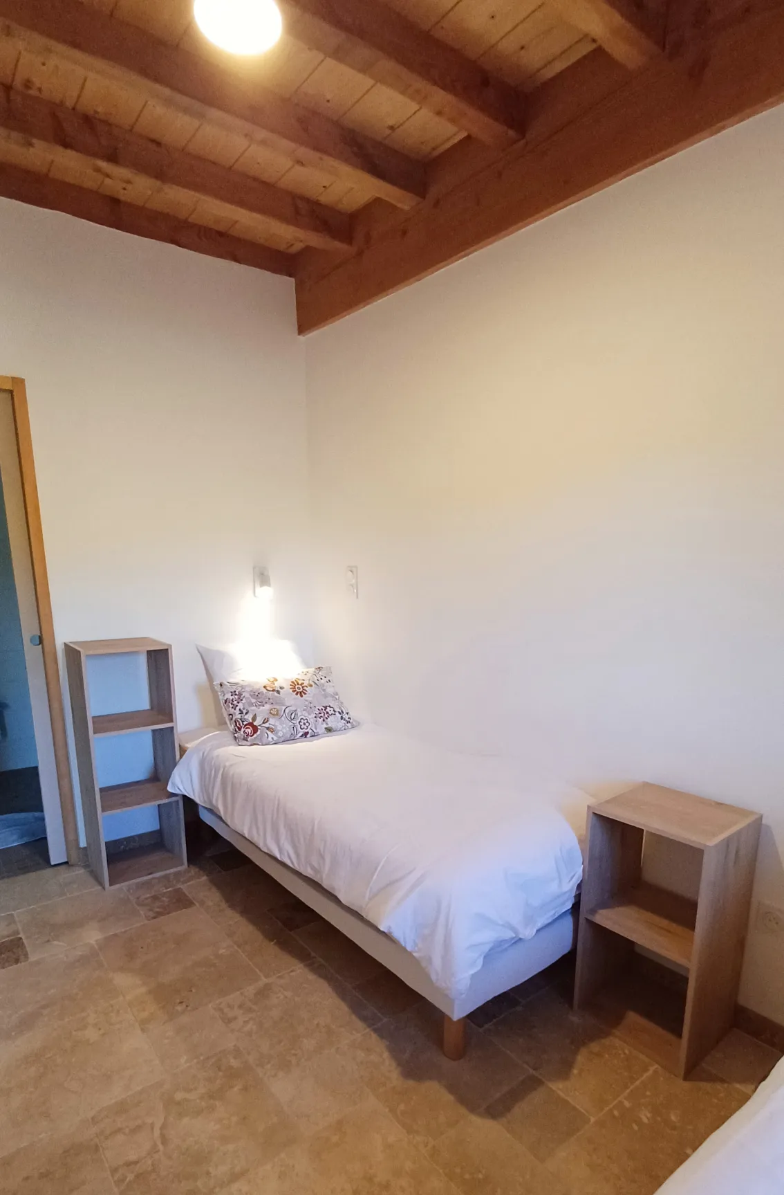 Loin de l’agitation, l’étage invite au sommeil et à la tranquillité, dans une atmosphère douce, ouverte sur la nature environnante.